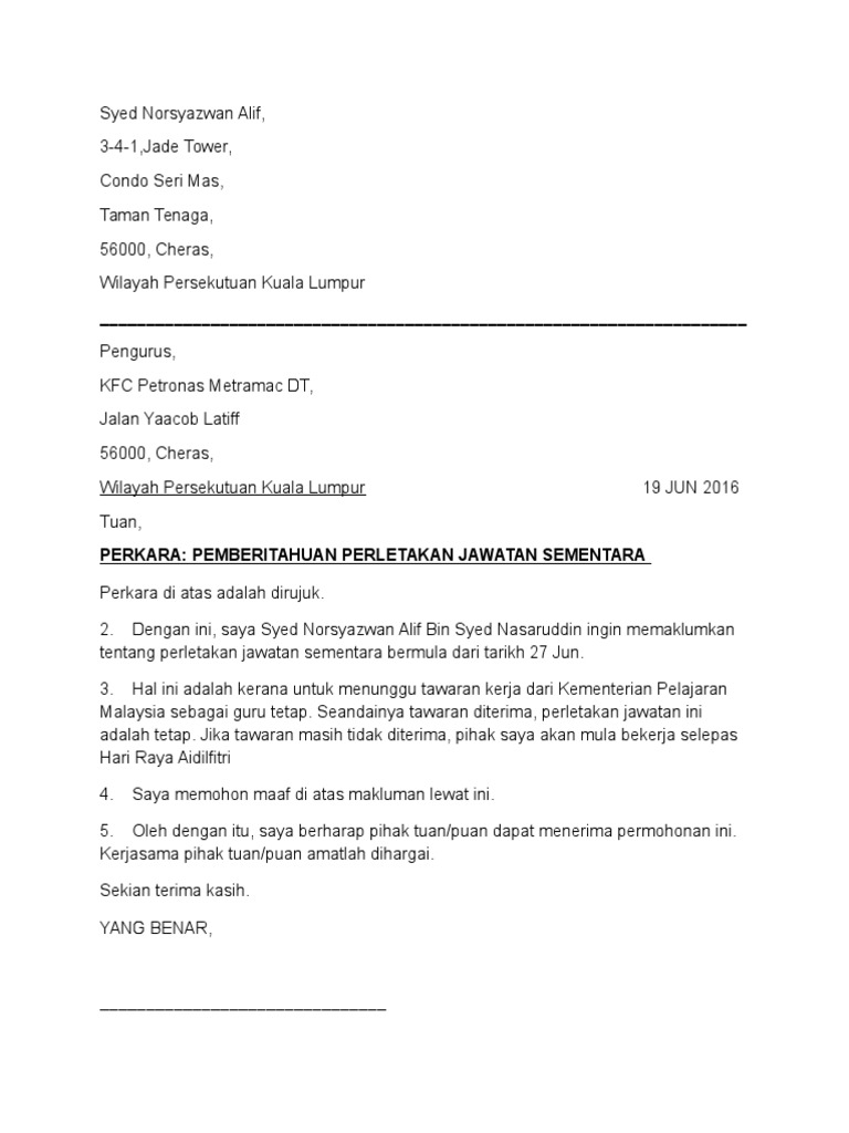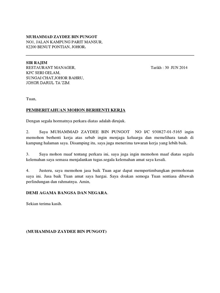 Related : Surat Berhenti Kerja Kfc : Contoh Surat Resign Kfc Contoh Surat : Contoh surat berhenti kerja bahasa melayu picture places..
